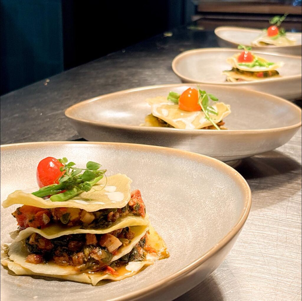 The Spinach Open Lasagne with Lamb Ragù felt familiar yet refreshed—layers of spinach pasta and slow-braised lamb finished with sour cream and roasted cherry tomatoes. Comforting, but lighter than expected.
