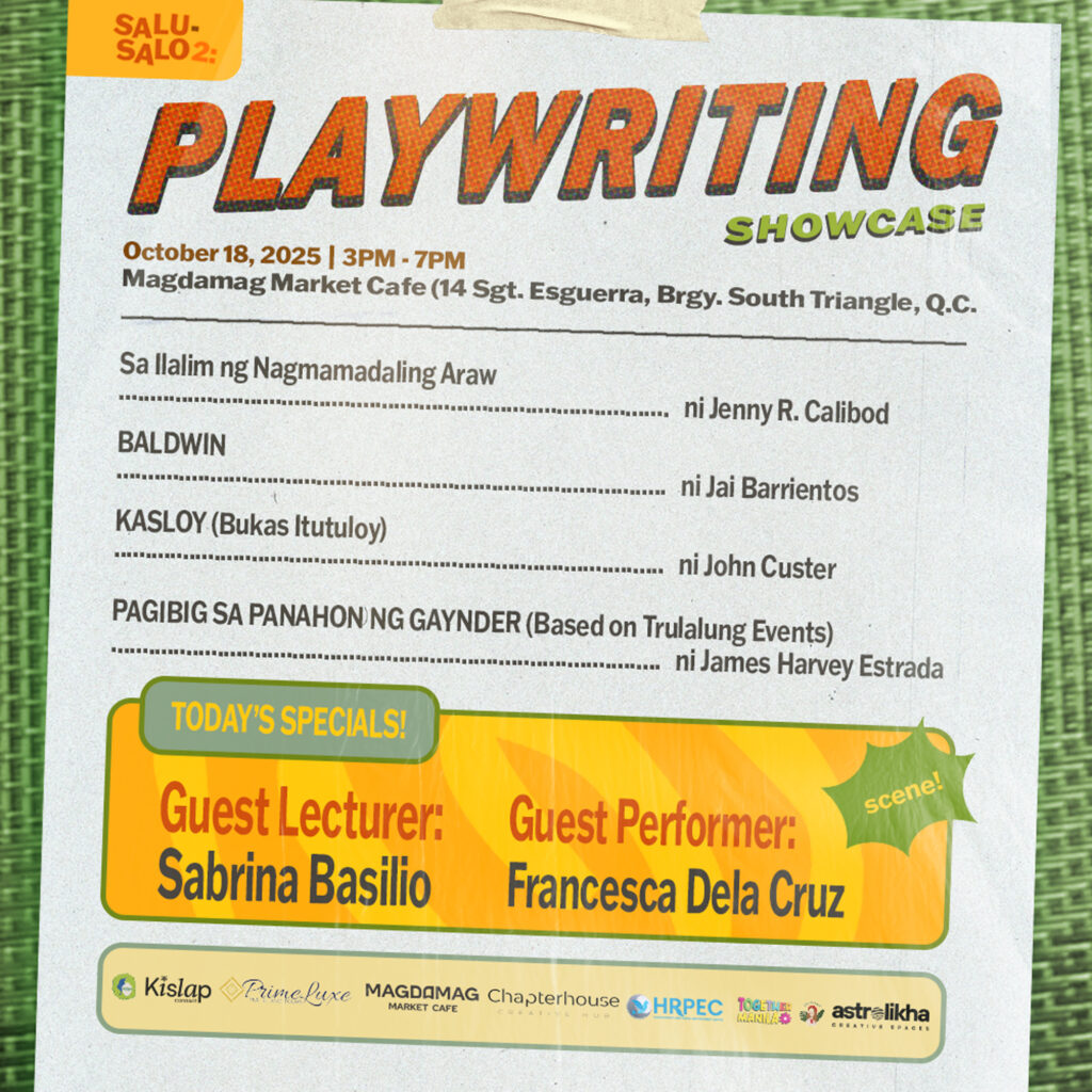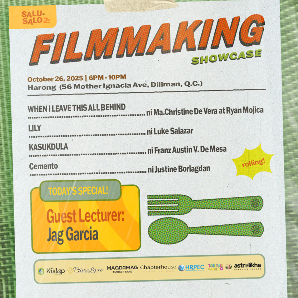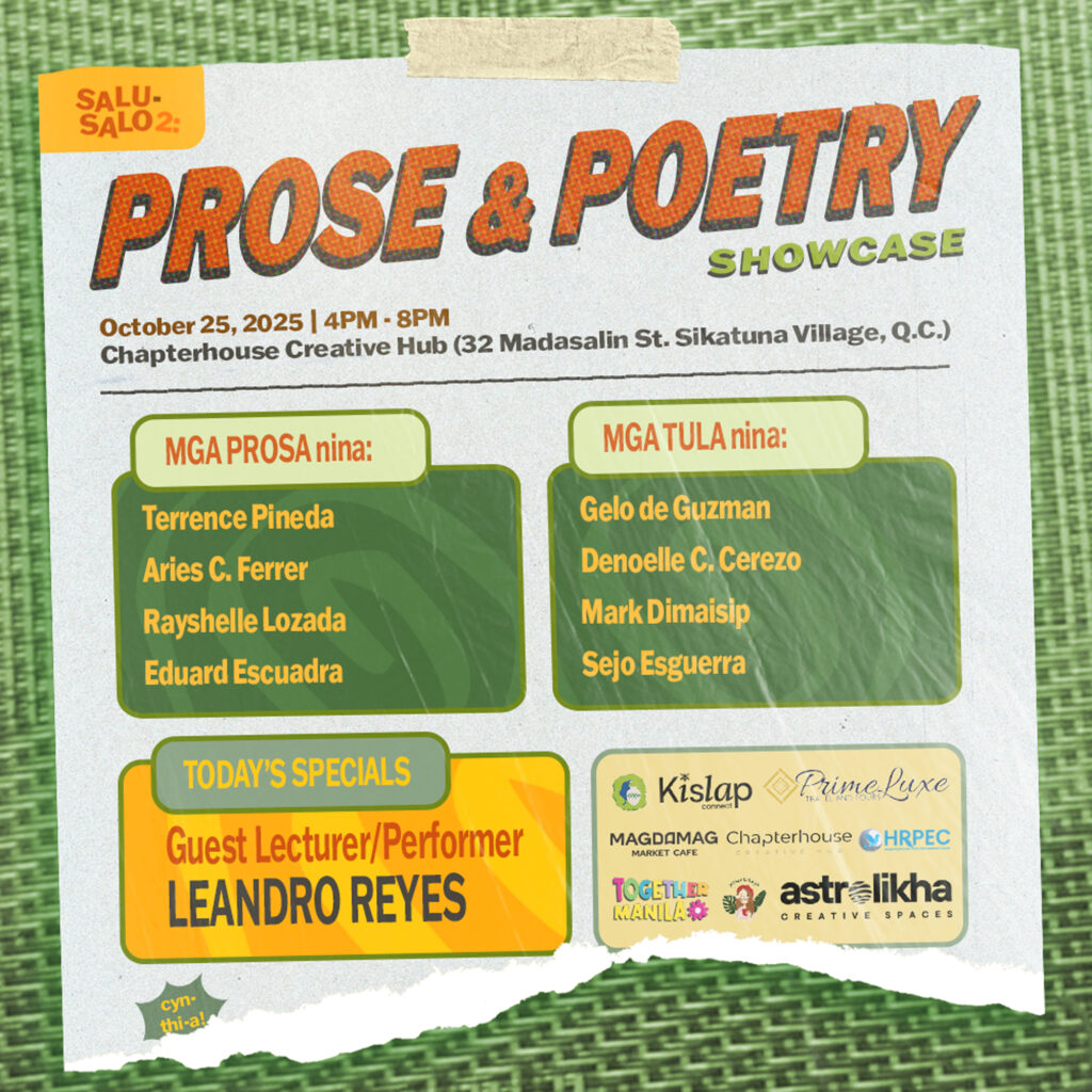 The festival opens with the Playwriting Showcase on October 18 (4–7 PM) at Magdamag Market Café, followed by the Poetry and Prose Showcase on October 25 (5–8 PM) at Chapterhouse Creative Hub, and concludes with the Filmmaking Showcase on October 26 (6–10 PM) at Harong Café. Each event highlights readings, screenings, and craft lectures by some of today’s most compelling voices in the creative scene, including Sabrina Basilio, Jag Garcia, and Leandro Reyes, with performances by Francesca Dela Cruz and Leandro Reyes.